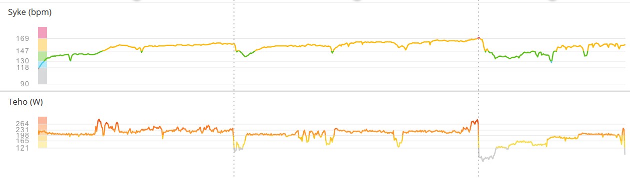 * Sisälsi lajivoimaa (kesto) 23min (ka. teho 222W, ka. syke 153min, kad. 42 rpm)