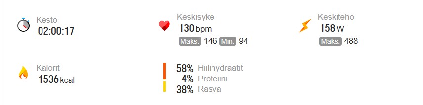 Traineri 2h 00min (ka. teho 158W, ka. syke 130/min, kad. 83rpm)