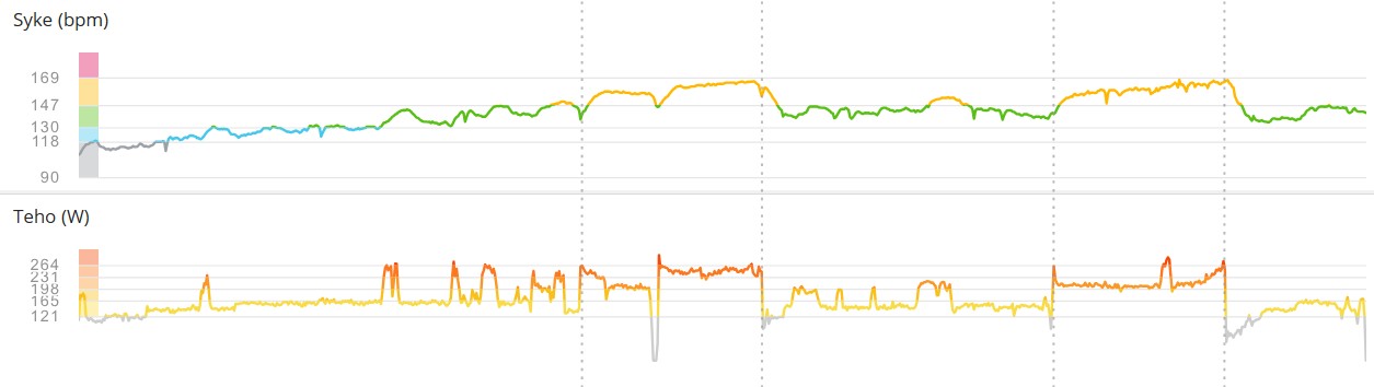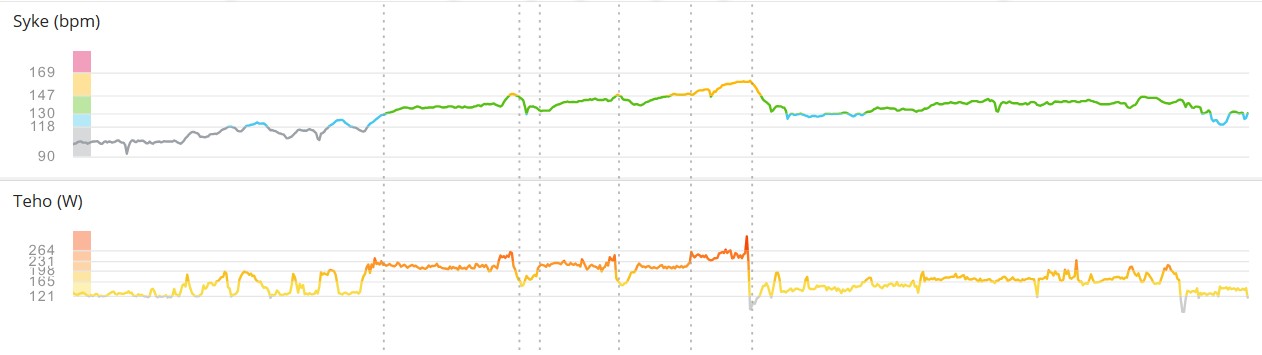 teho 217W, ka. syke 141/min) + 1 x 3min 40s (ka. teho 200W, ka. syke
