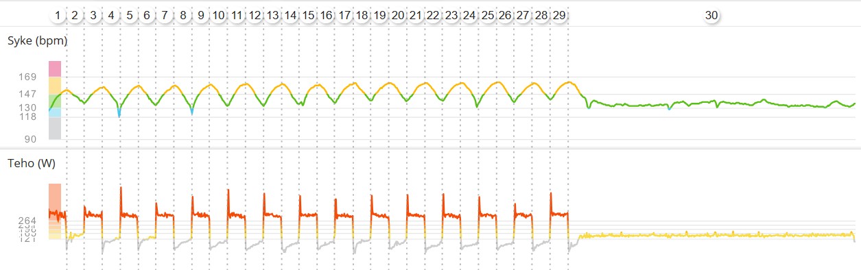 Sisälsi: 1 x 10min kovaa (ka. teho 232W, ka. syke 149/min, max. syke 162/min) + 1 x 3min kovaa (ka. teho 257W, ka. syke 148/min) + 1 x 30sek erittäin kovaa (ka. teho 478W) + 1 x 30sek erittäin kovaa (ka. teho 482W).